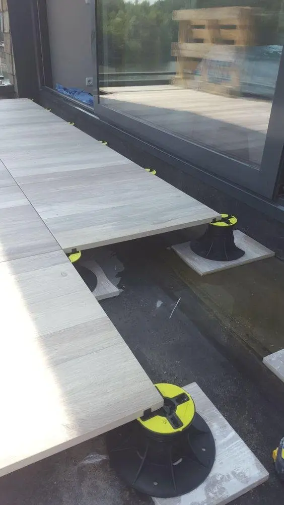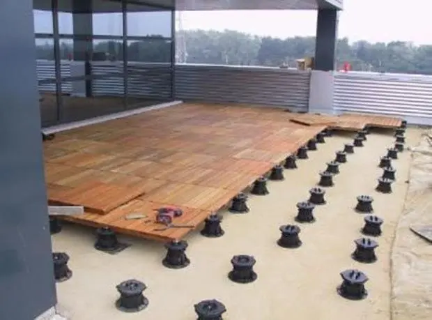 其实这高架式干铺在国外是很流行的,应用也很广泛,石材、木材以及瓷砖都适用,基本上师傅半天就能铺完几十平,施工过程中干净卫生,用这种方法给露台铺上防腐木地板,夏天光脚踩在上面跑都没问题!