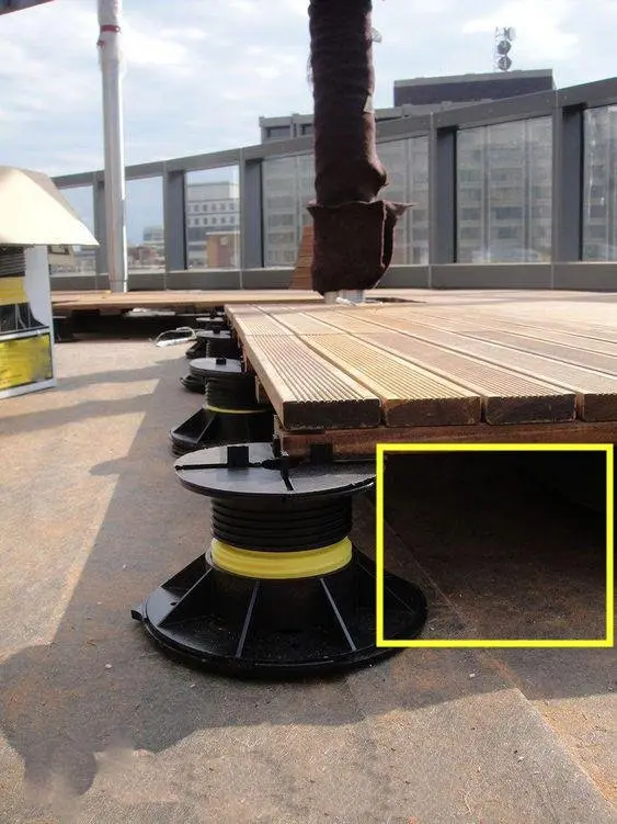 其实这高架式干铺在国外是很流行的,应用也很广泛,石材、木材以及瓷砖都适用,基本上师傅半天就能铺完几十平,施工过程中干净卫生,用这种方法给露台铺上防腐木地板,夏天光脚踩在上面跑都没问题!